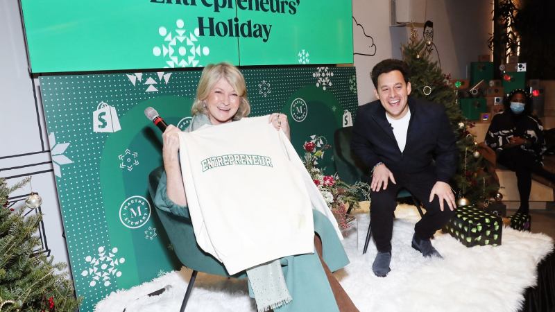 On Thursday, December 9, Shopify’s Soho headquarters was transformed into a winter wonderland to celebrate local NYC entrepreneurs with a fireside chat between iconic businesswoman Martha Stewart and Shopify president Harley Finkelstein. Gifts from Stewart’s 2021 Holiday Collection were on display, and party-goers enjoyed refreshments (think truffle-parmesan popcorn and milk-and-cookie shots) while Stewart and Finkelstein discussed Stewart’s illustrious, decades-long career; the role technology plays in today’s business world; and how to harness the power of brand- and team-building for maximum success.
