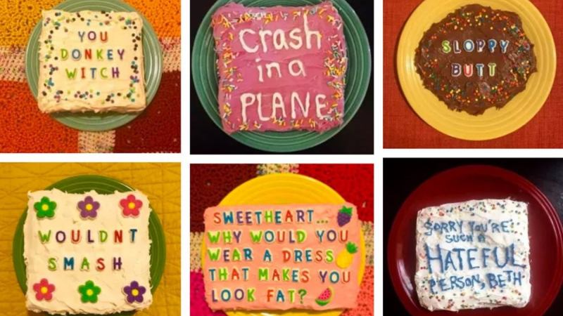 They’ve made delightfully colorful cakes decorated with all kinds of not-so-nice messages: everything from “you donkey witch” to “crash on a plane,” “sloppy butt,” “wouldn’t smash” and “ur mom is obese.”
