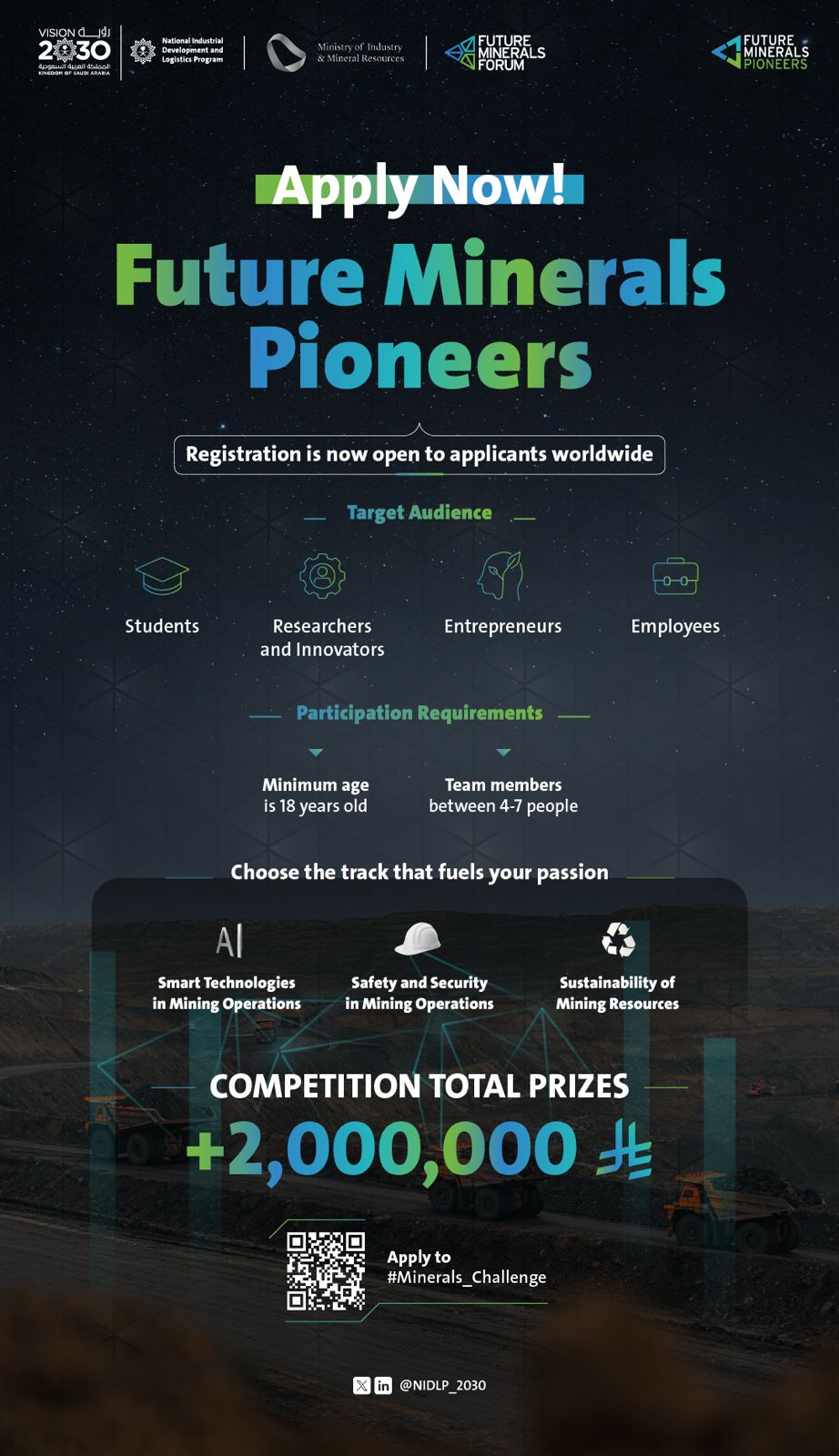 Building the Future, One Idea at a Time: Saudi Arabia's Global Minerals Innovation Competition Saudi Arabia has launched the Global Minerals Innovation Competition – "Future Minerals Pioneers", inviting entrepreneurs, researchers, and innovators worldwide to develop breakthrough solutions in smart technologies, safety, and sustainability for the mining sector