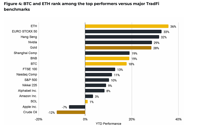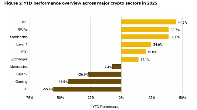 In the meantime, the cryptocurrency market's capitalization increased 9.9 per cent YTD even after a pullback in the first quarter. Sectors like DeFi, RWAs, and stablecoins even outperformed this growth, with gains exceeding 38 per cent.