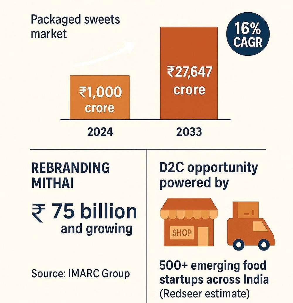 India's New-Age Brands are Turning Mithai into Scalable D2C Ventures Leveraging online retail, modern logistics, and shifting consumer interests, new-age startups are rebranding mithai for modern consumers, turning it into a year-long business