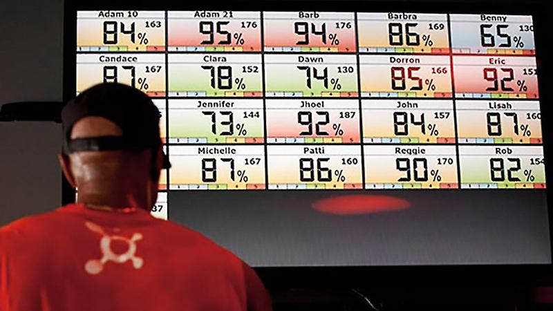 “The science behind interval training is getting people in certain heart-rate zones to improve their cardiovascular health as well as their ability to burn calories and body fat,” Long explains. For that reason, personal-health technology plays an important part in Orangetheory’s signature 60-minute workout, alongside treadmills, rowing machines and weights. Clients’ heart rates are monitored throughout the workout and displayed on flat-screen TVs.