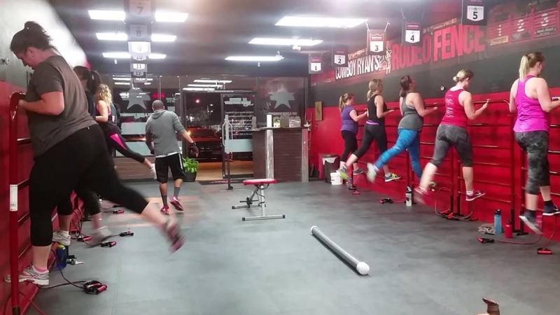 Most of the action takes place on six-rail rodeo fences bolted all along the walls, where clients step, stretch and do dozens of unique Cowboy-designed exercises. When the cowbell rings after each minute, they all let out a whoop.